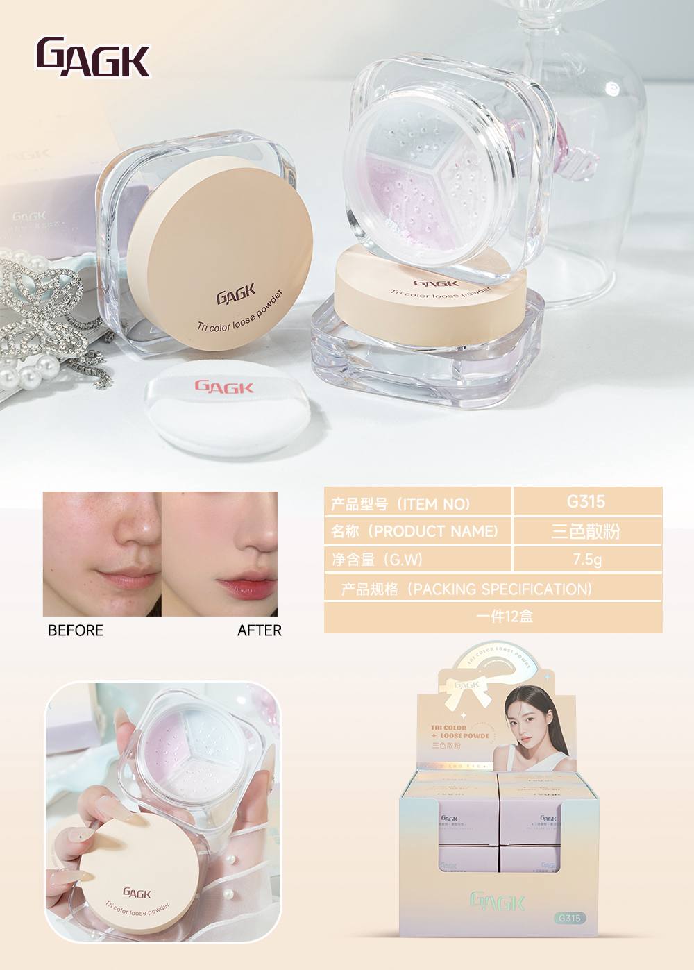 نام محصولپودر فیکس سه رنگبرندگک GAGKنوع بافتپودری نرم و سبککاربردفیکسکننده، ماتکننده، کنترل چربی، روشنکنندهکشور مبداچین