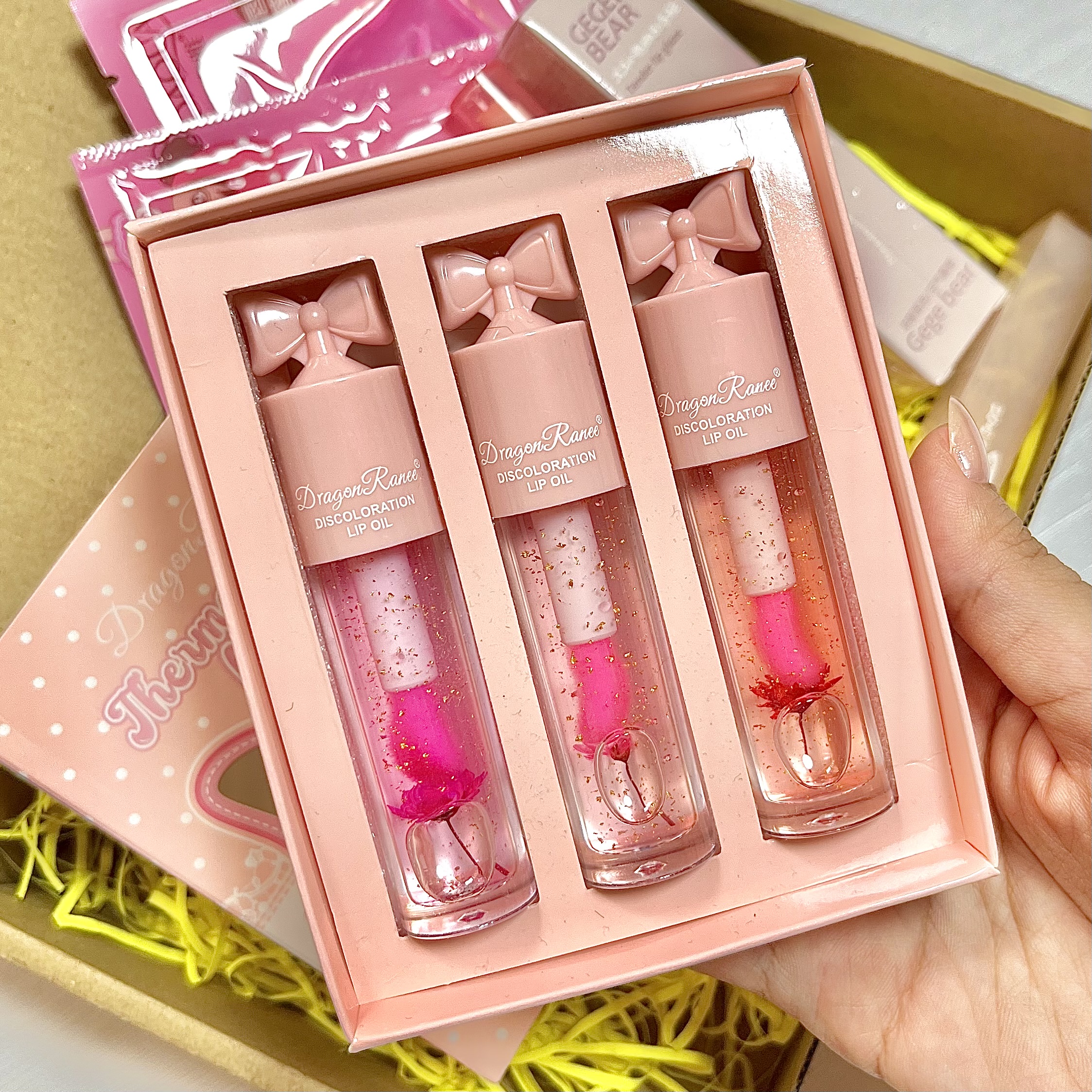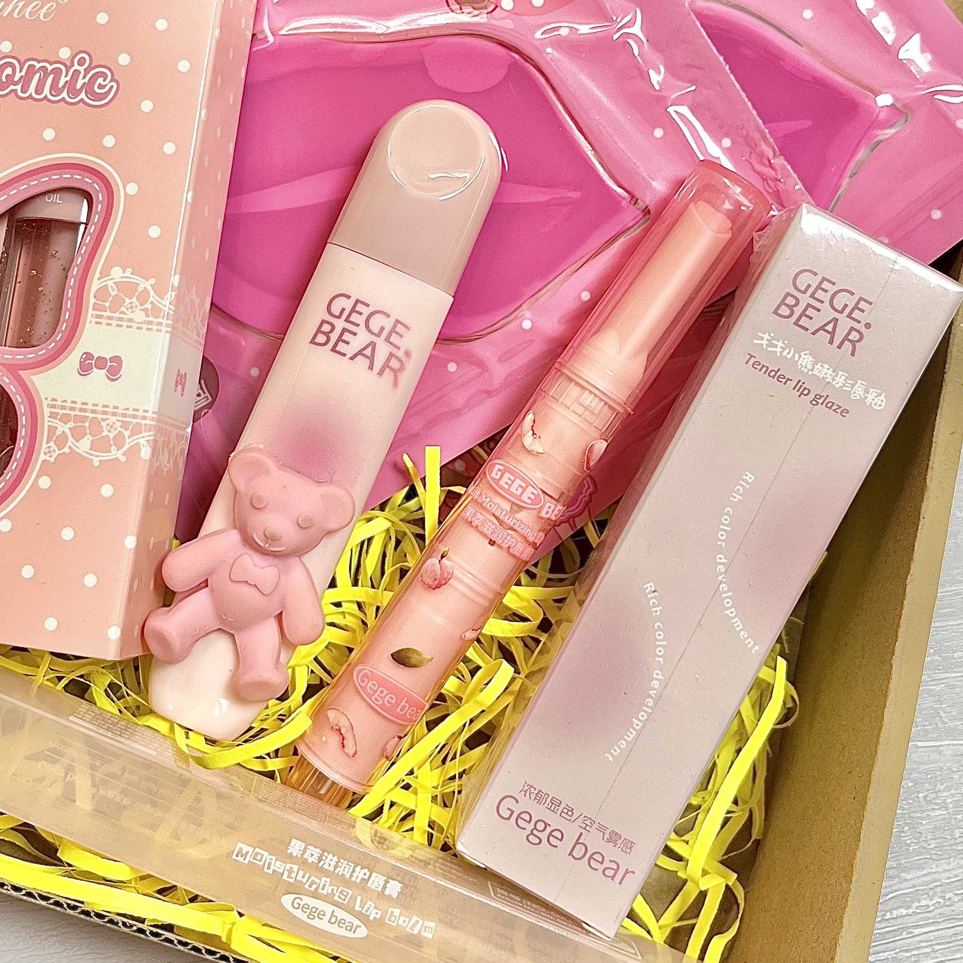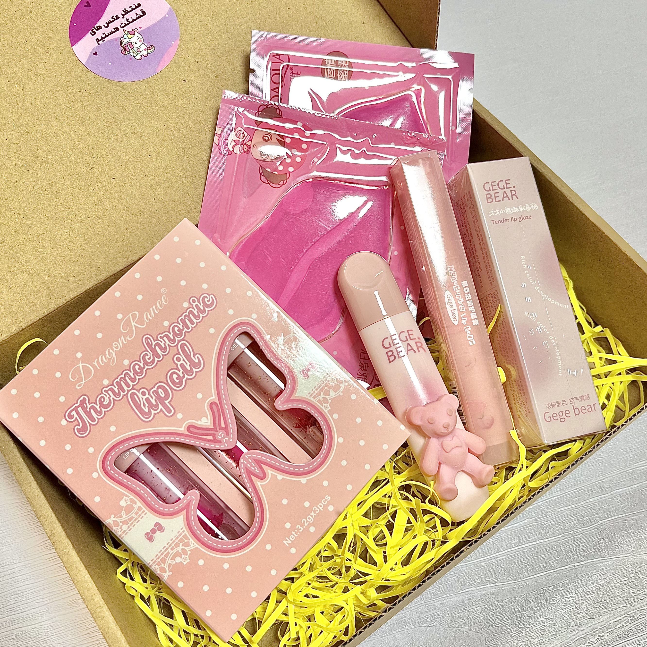 پک ۳ تایی گلدار دراگون ، رژلب مایع مات و مخملی خرسی Gege bear ، بالم لب قلبی پلامپری از برند محبوب Gege bear ، دو عدد ماسک لب