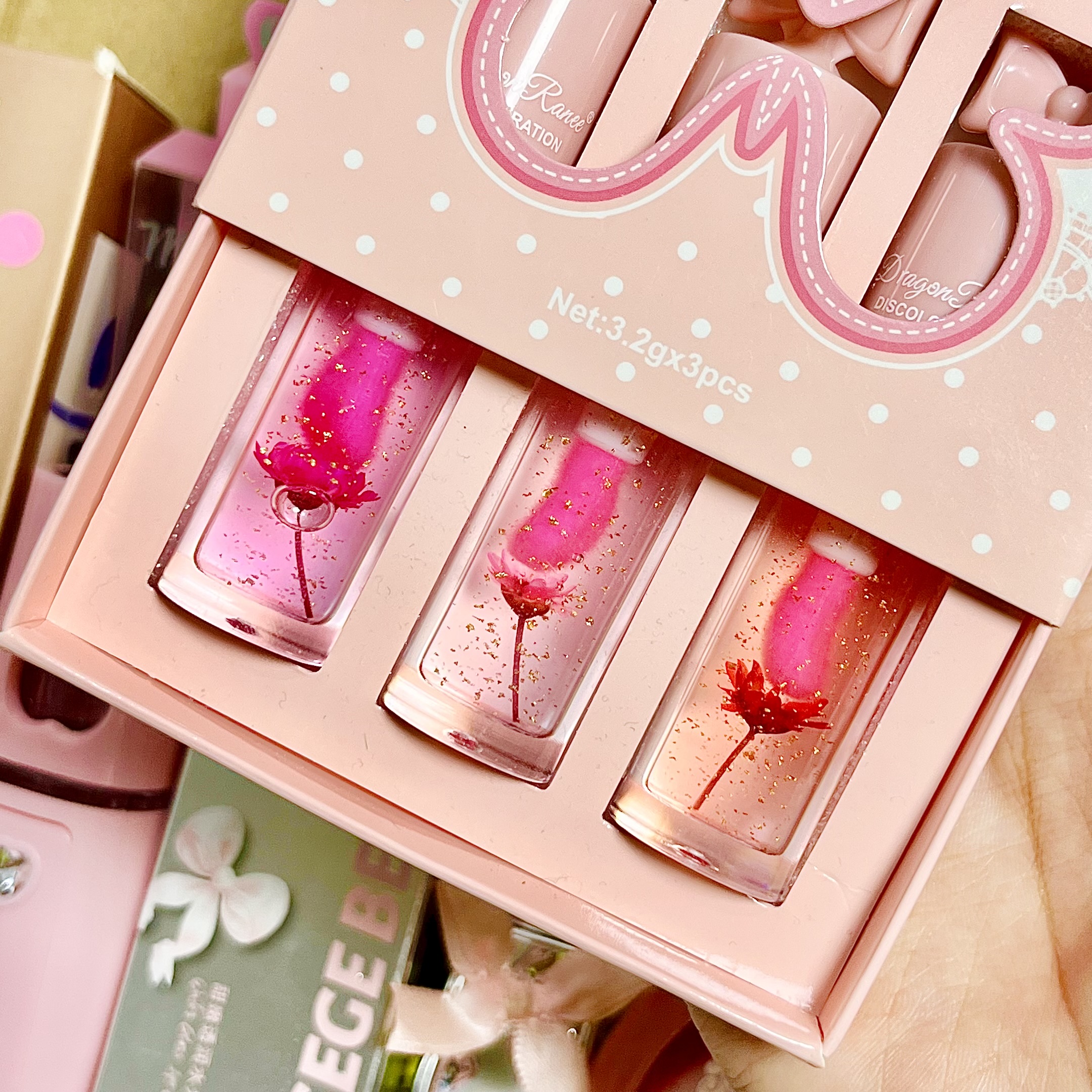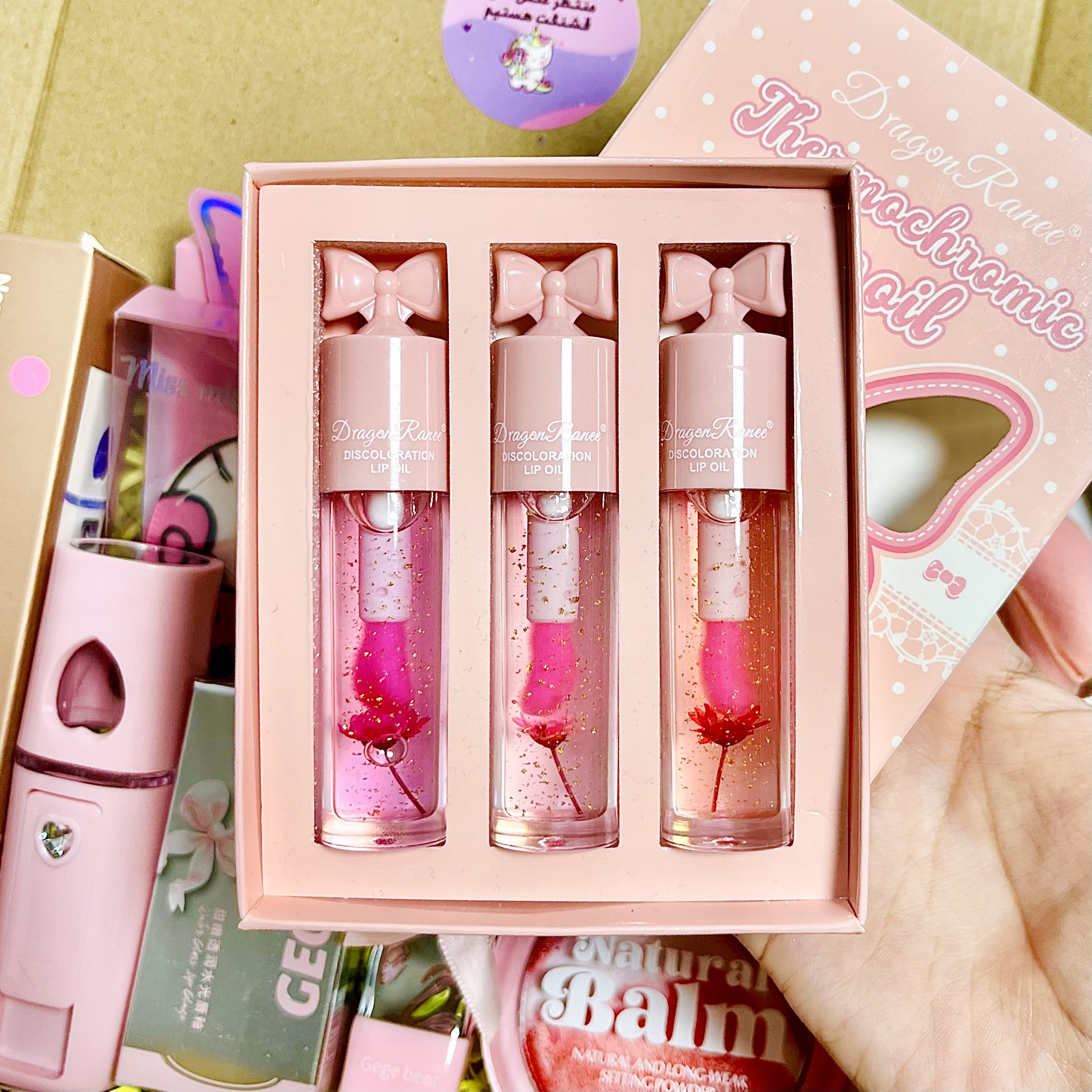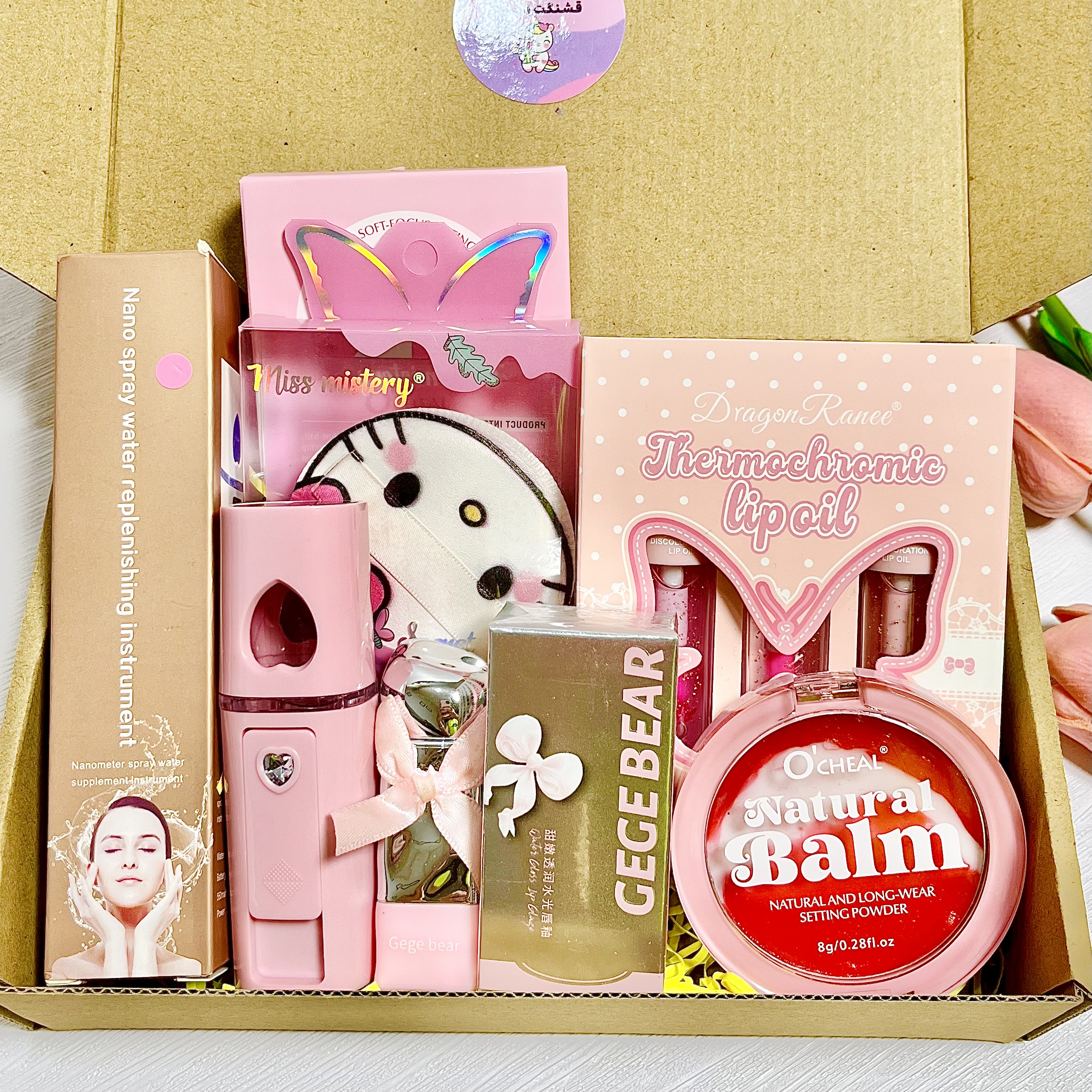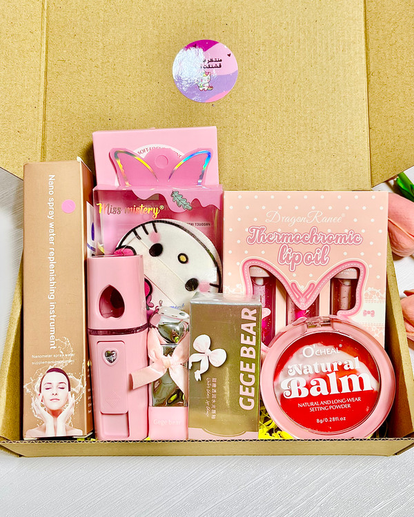 این باکس هدیه آرایشی دخترانه شامل مجموعهای از محصولات فانتزی و کاربردی برای آرایش روزانه و مراقبت از لب و پوست است. ترکیب لیپ گلاسهای براق و جذاب در کنار پنکیک و بخور سرد جیبی، این پک را به یک انتخاب خاص برای هدیه تبدیل کرده است.
