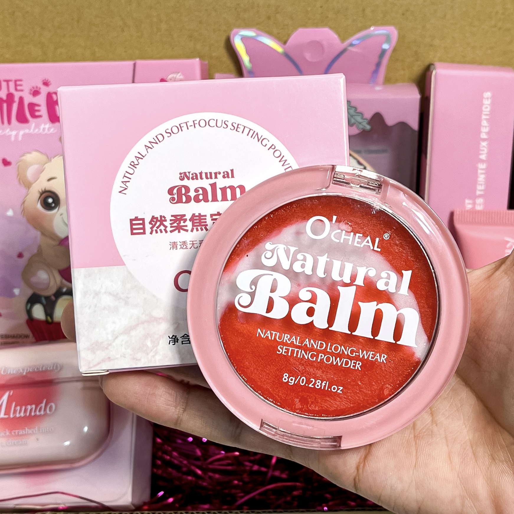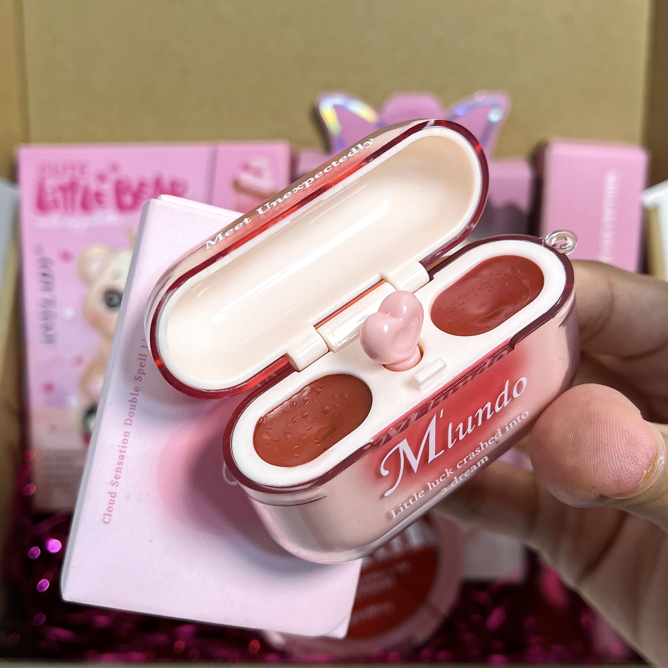 محصولات موجود در باکس: پالت سایه خرسی کاربردی ، رژلب ایرپادی ، پد انگشتی هلو کیتی ، برق لب دراگون ، لیپگلاس ریموکو