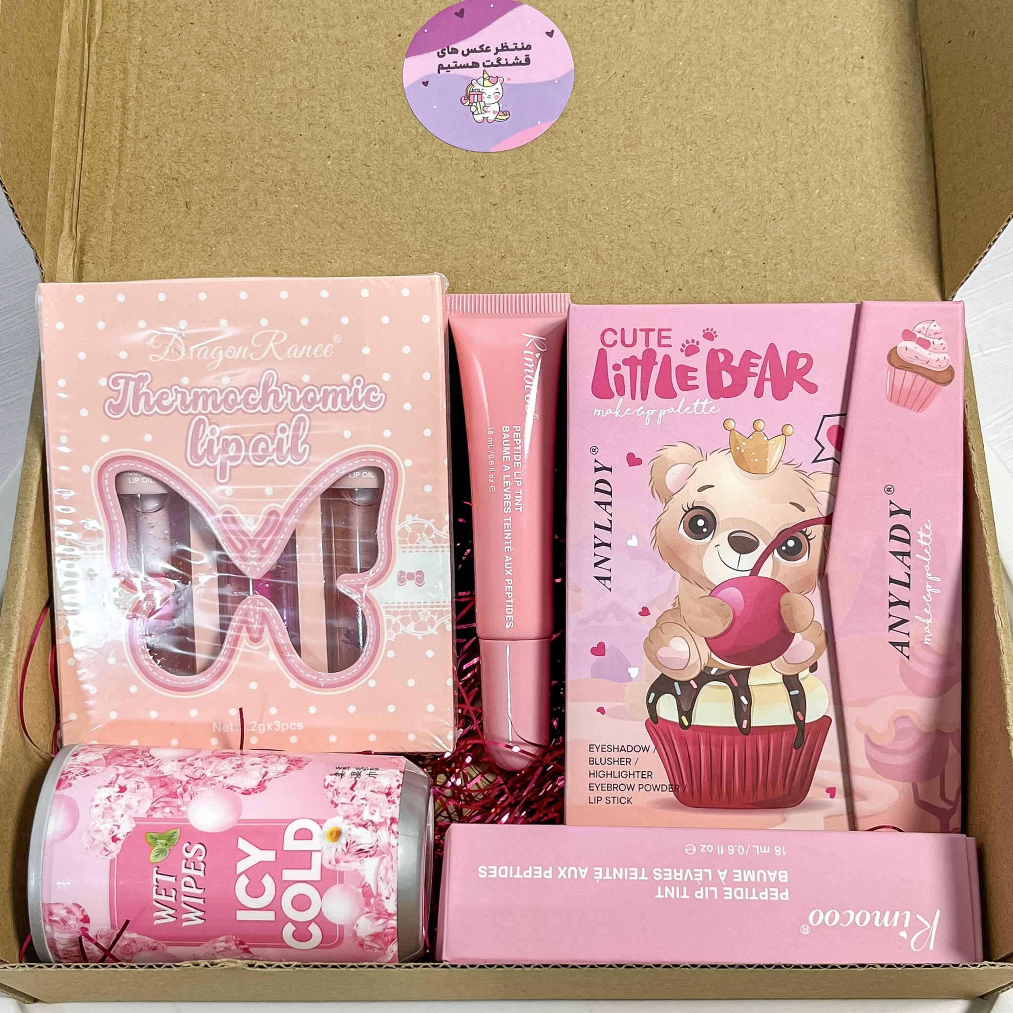 محتویات باکس: پالت سایه خرسی (سایه ، هایلایتر ، رژگونه ، رژلب ، کانتور) ، پک ۳ تای لیپ اویل پروانه ای دراگون ، لیپگلاس طرح رود ریموکو ، دستمال مرطوب پپسی